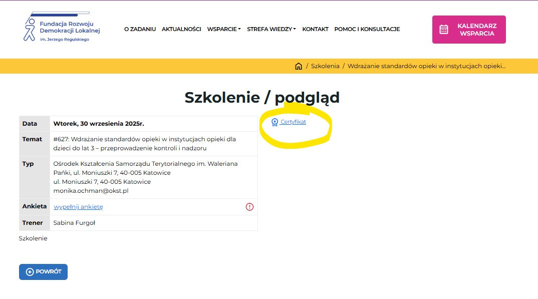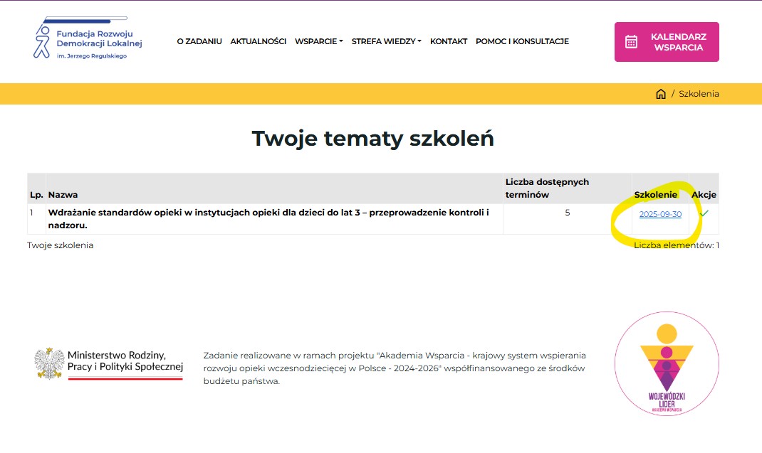 Teraz należy kliknąć na datę w kolumnie SZKOLENIE - co z kolei otworzy następujący widok: